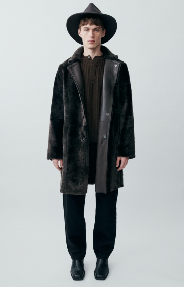 Langer Mantel aus Lammfell, der sich beidseitig tragen lässt, mit matter Lederseite oder hochwertiger Lammfellseite außen. Geschlossen wird das Modell mit dezenten von Hand angenähten Druckknöpfen. Die cleane Formgebung unterstreicht den modernen, urbanen Look.