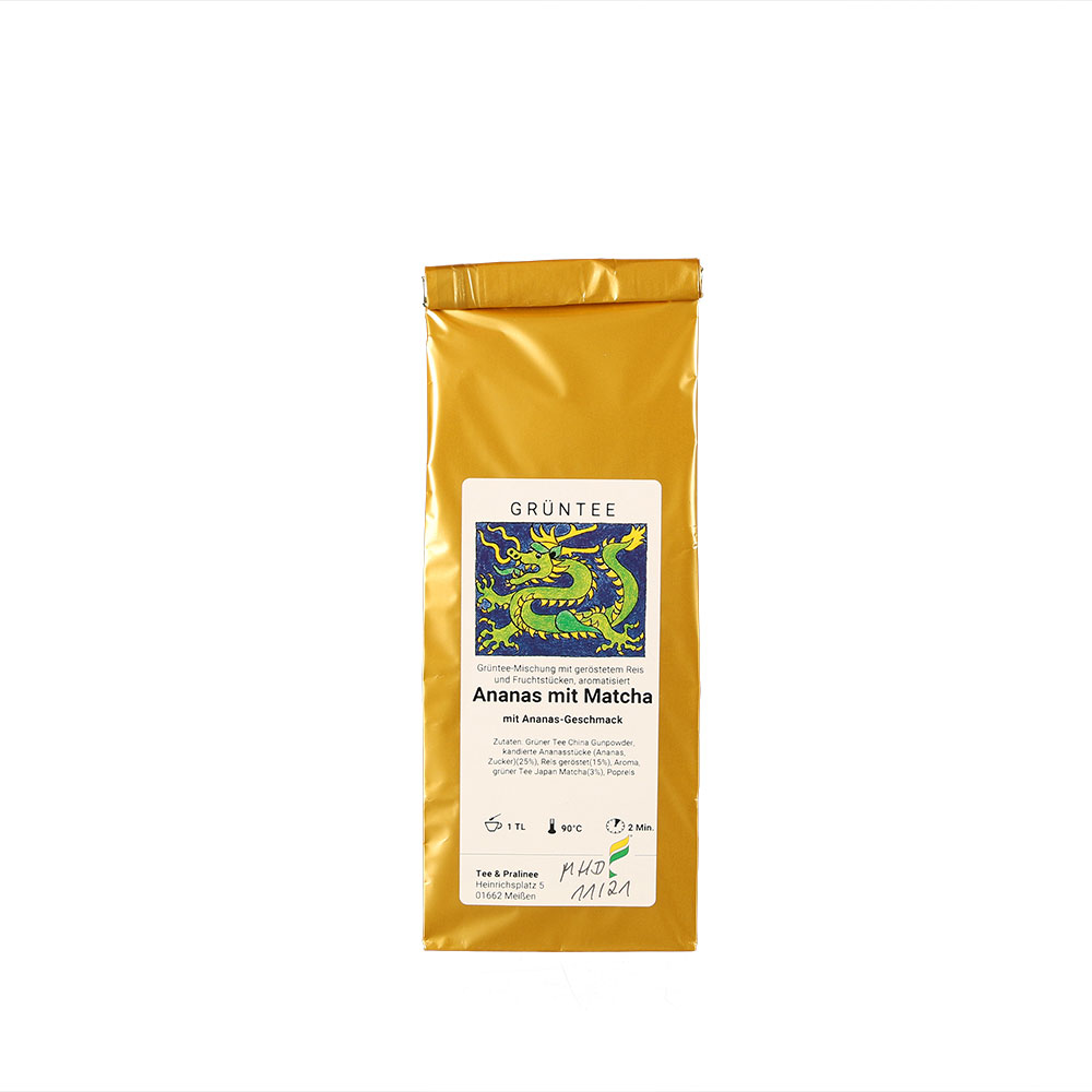 Fein-herber grüner Tee China Gunpowder trifft auf vollmundigen Japan Matcha. Diese fruchtige Mischung wird mit geröstetem Reis und Popreis versetzt und mit Fruchtstückchen, aromatisiert. Im Vordergrund des Duftes und Geschmacks steht jedoch frische Ananas, welche in Form von kandierten Stücken und Aroma beigemengt wurde. Der Tee ist sehr erfrischend und genau das richtige für Liebhaber der exotischen Frucht.