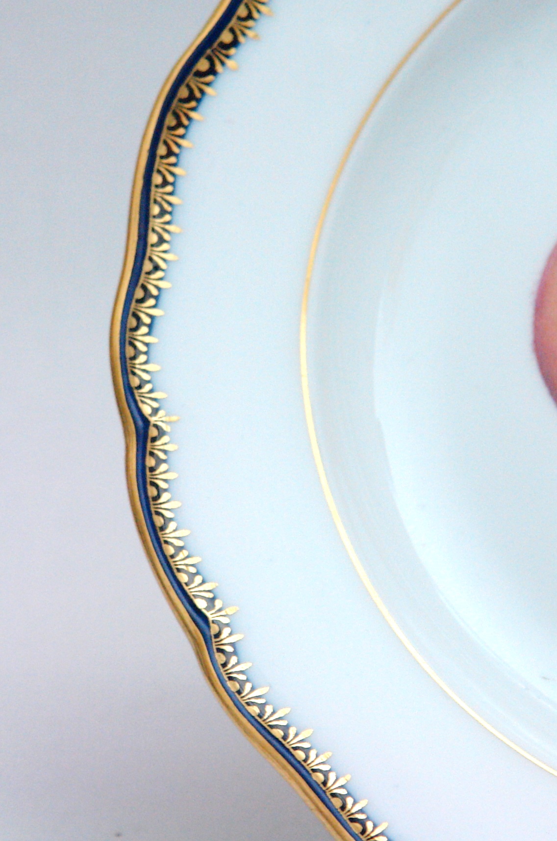 Dekor: Meißner Porzellan, Dessertteller mit Fruchtmalerei, Pfirsich und Pflaumen, königsblauer Reifen glasiert,