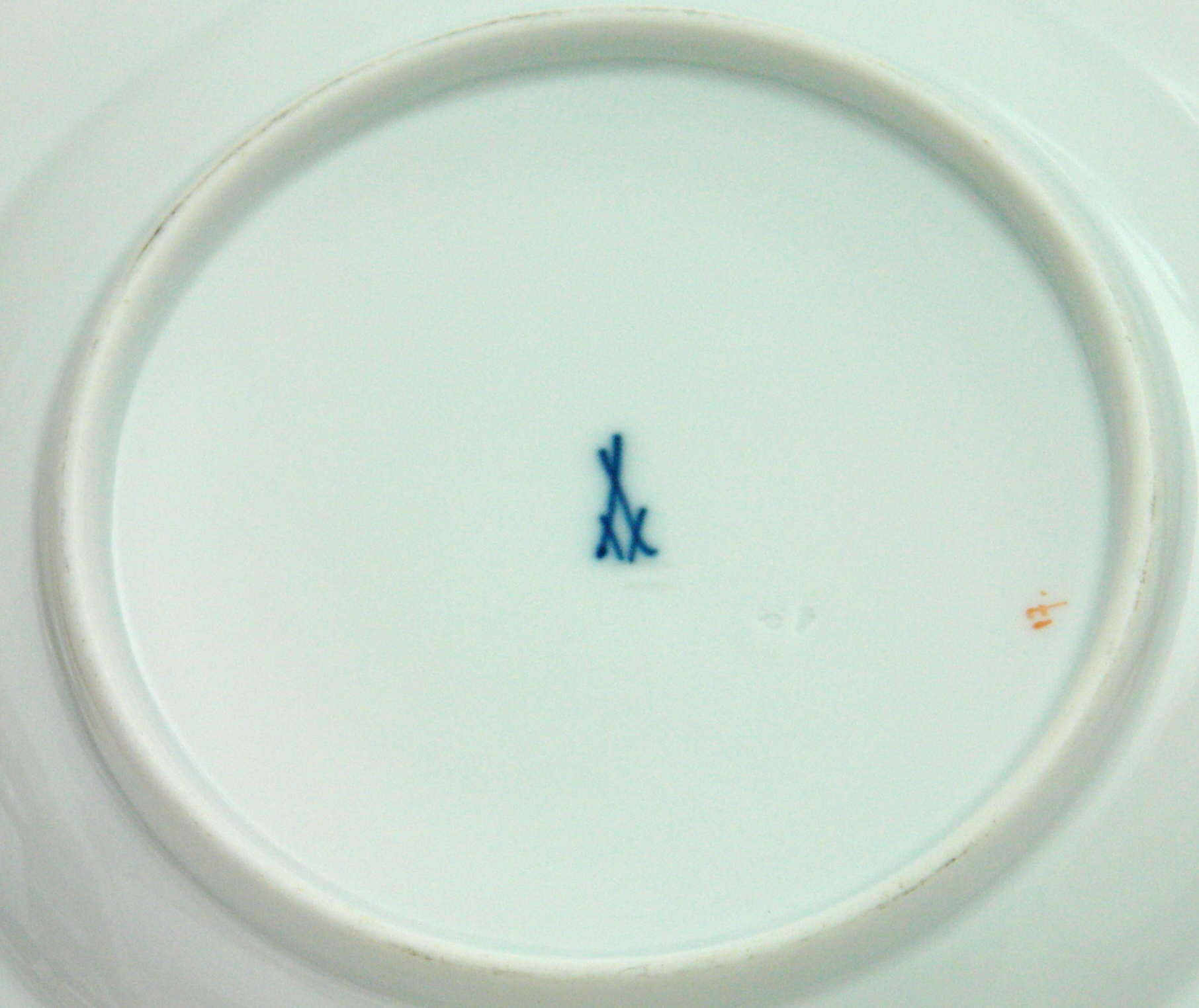 Meißen, Meißner Porzellan, aufglasur, Malerei, Aufglasurmalerei, relieffiert, staffiert, blaue Schwerter, gekreuzte, Altmeißen, handgemalt, polychrom, B-Ware, Zweitsortierung, zweite Wahl, 2.Wahl, Handmalerei, Korbrandrelief, gemustert