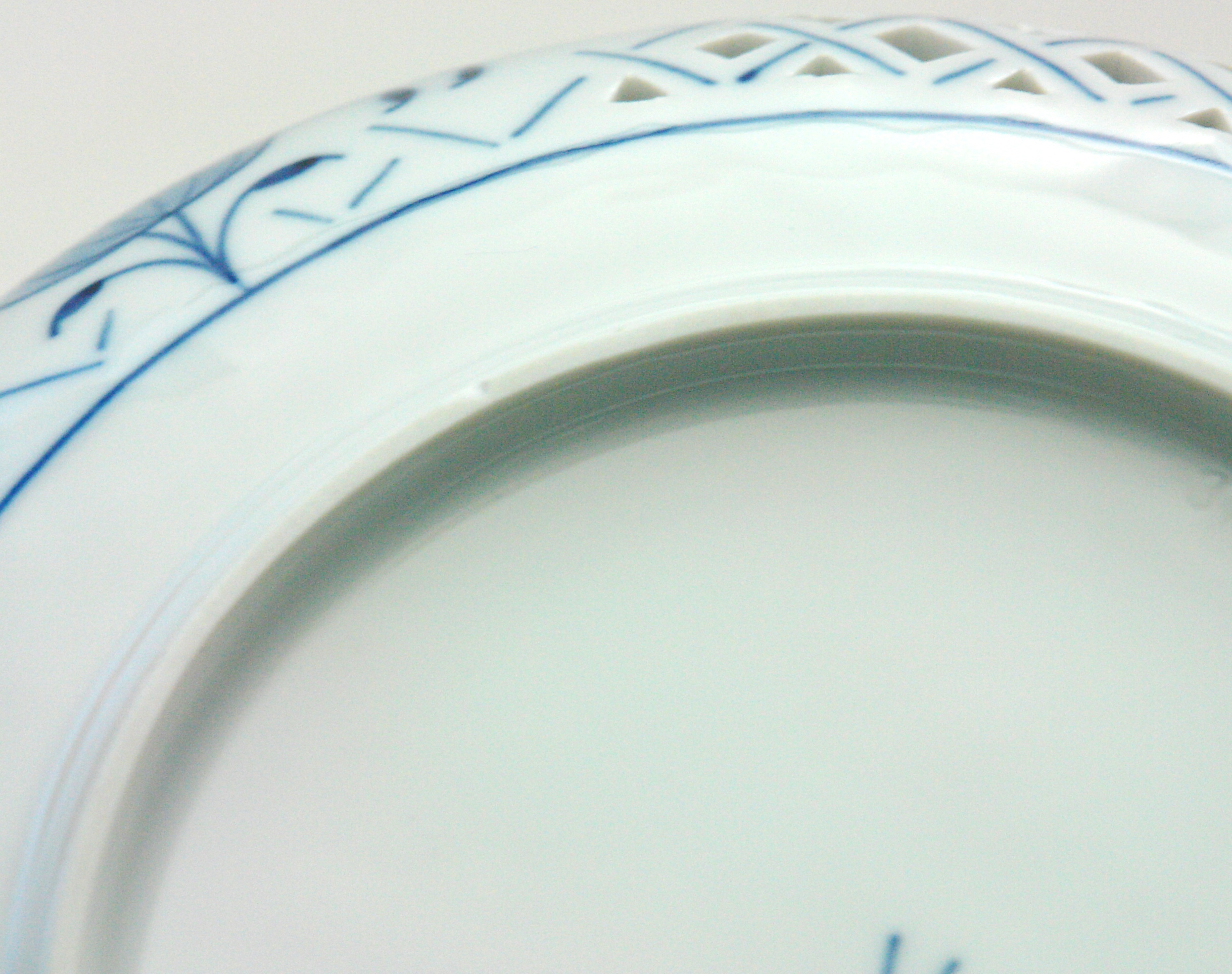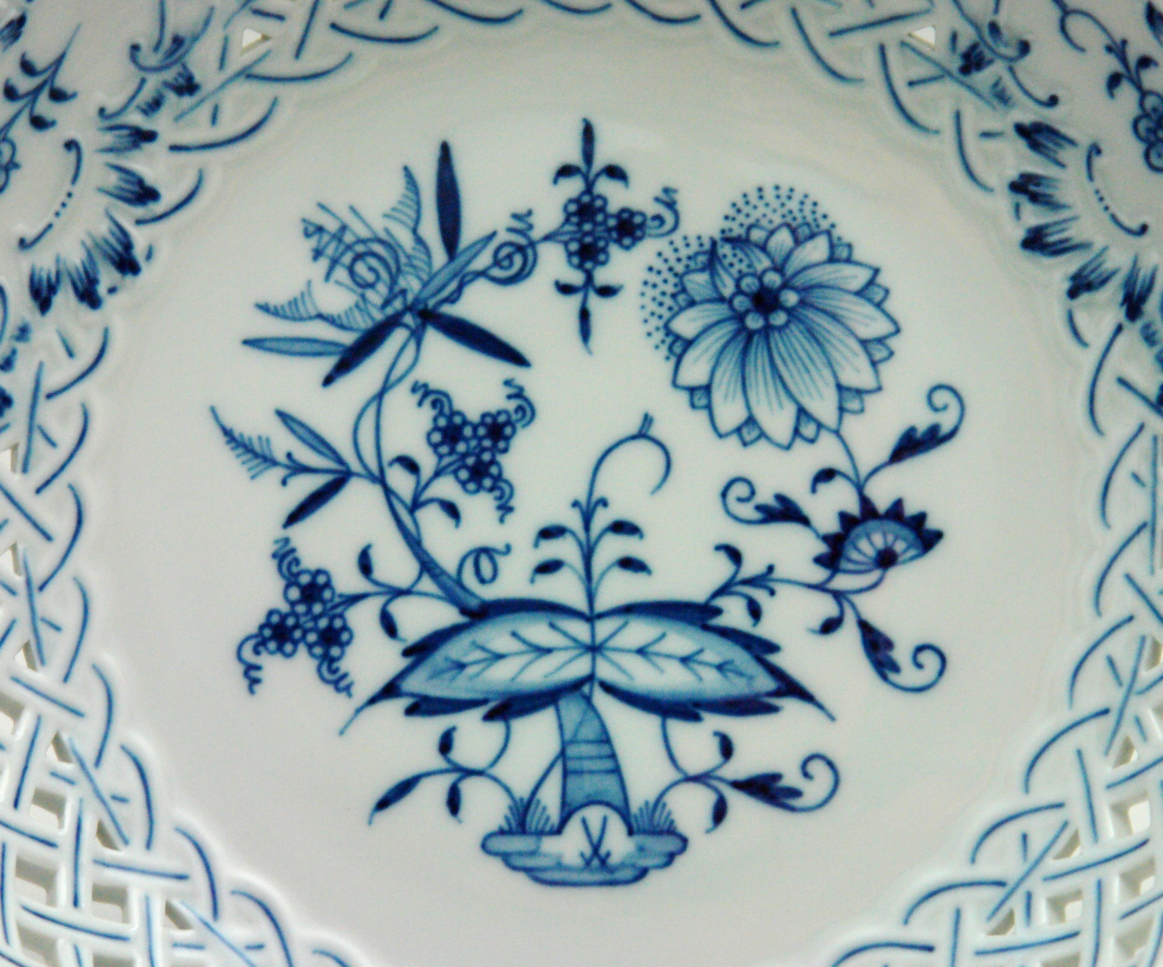 Dekor: Meißner Porzellan, runde Durchbruchschale im Zwiebelmuster Design, kobaltblau, weißer Rand (Dekor 800101)