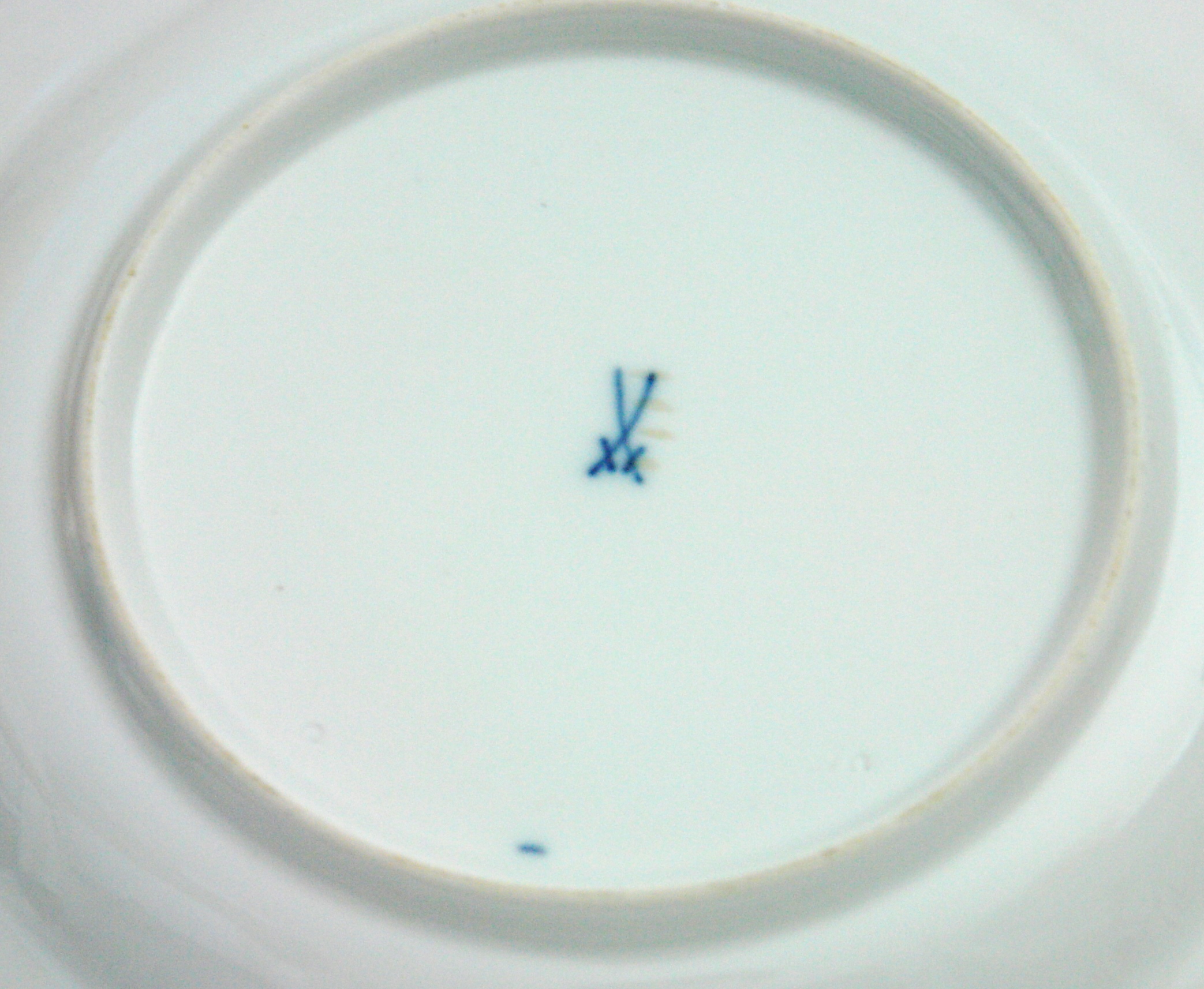 Meißen, Meißner Porzellan, aufglasur, Malerei, Aufglasurmalerei, relieffiert, staffiert, blaue Schwerter, gekreuzte, Altmeißen, handgemalt, polychrom, Mitarbeiterware, Deputat, purpur, blau, indischpurpur, Goldstaffage