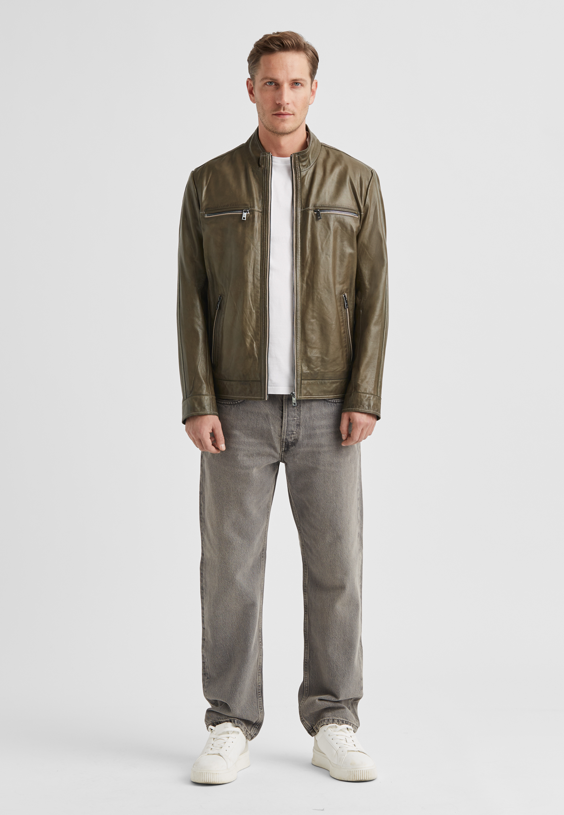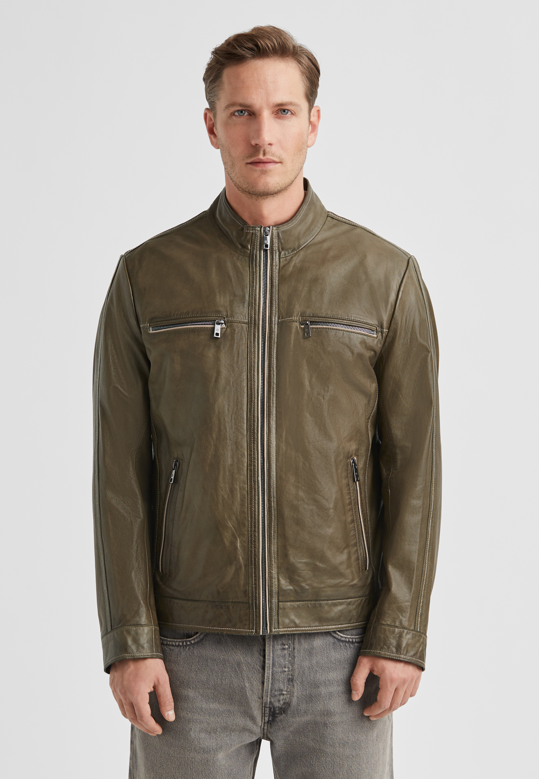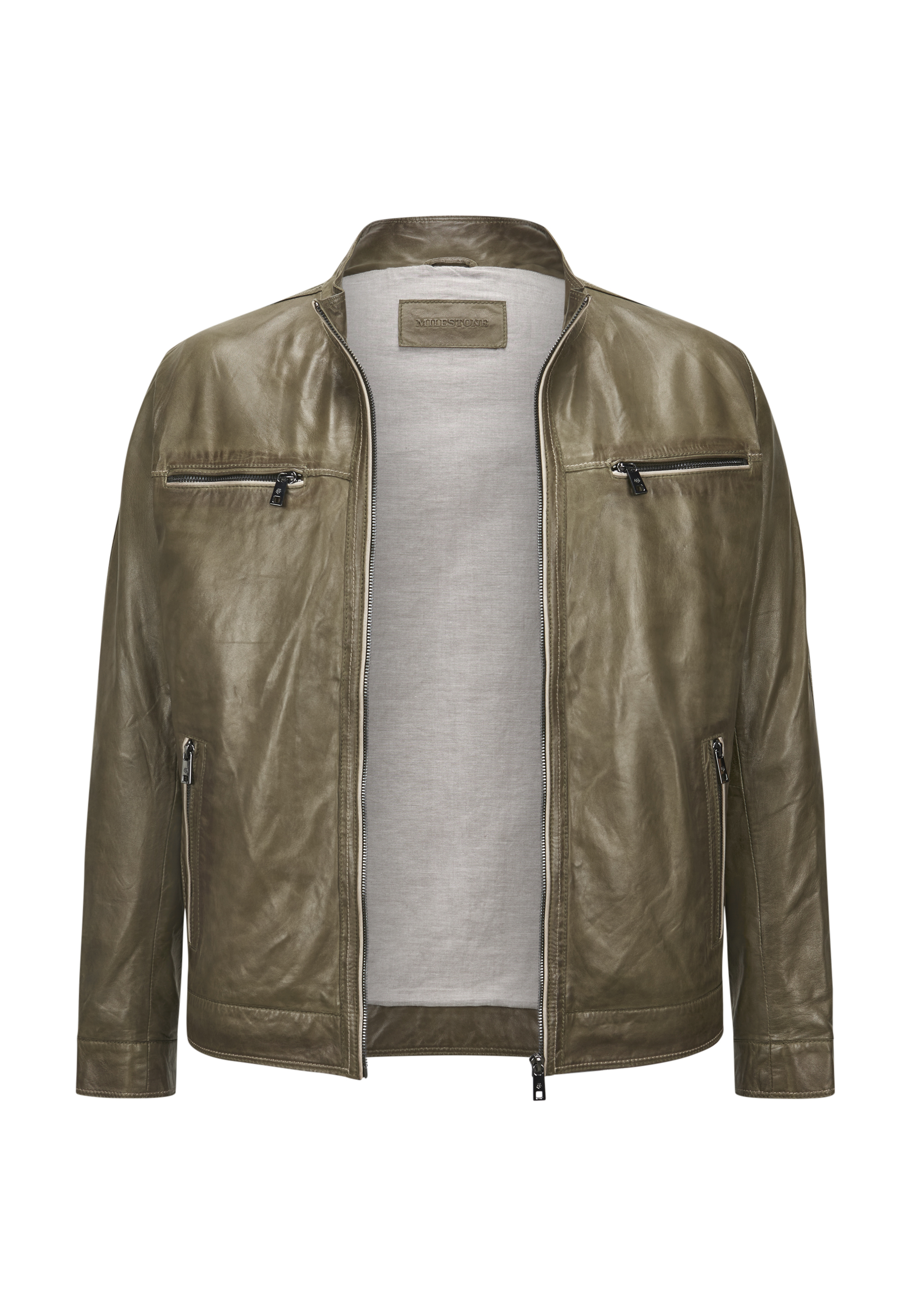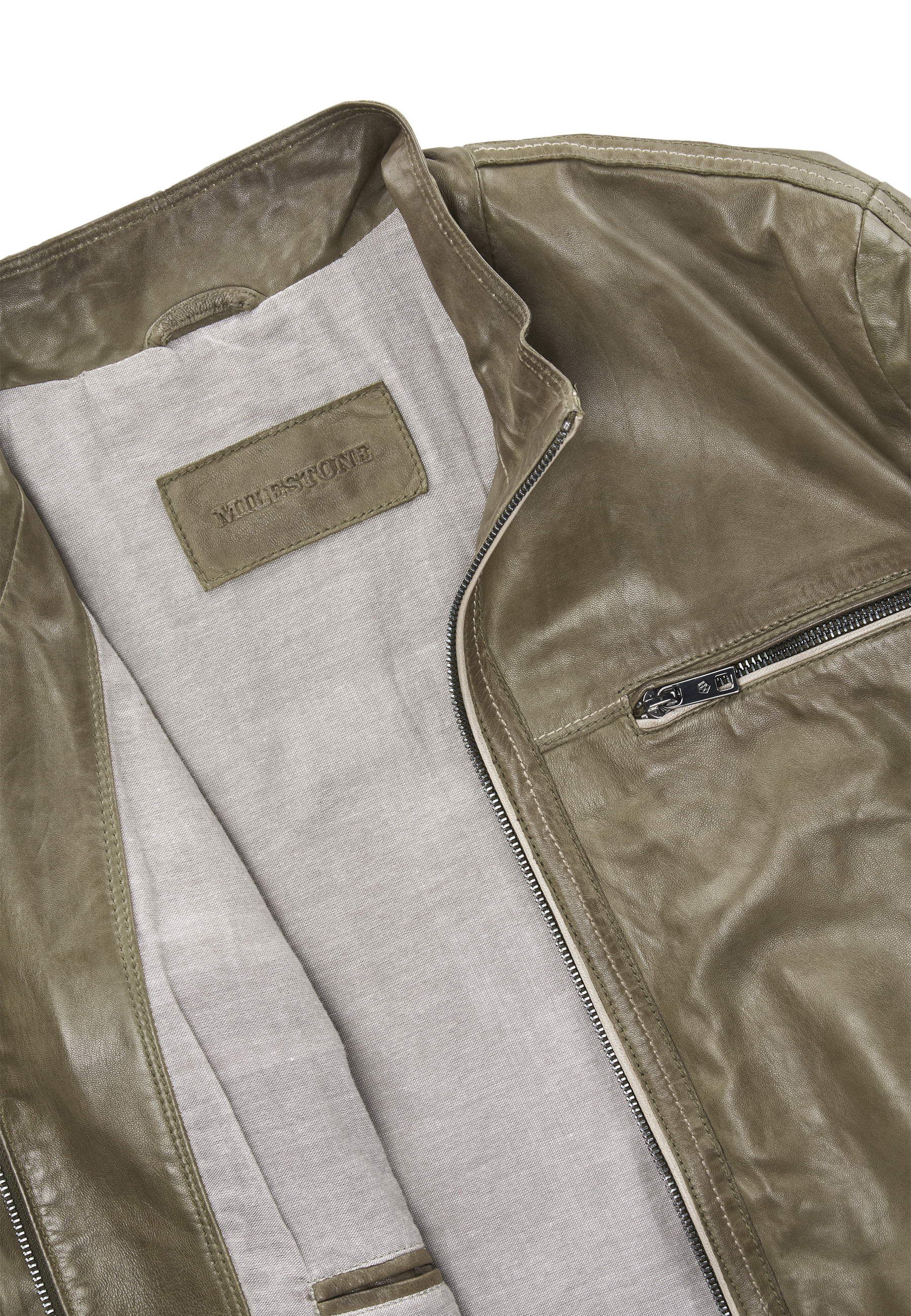 Das weiche Lammnappa in gedecktem Olivton definiert sich durch charaktervolle Kontrastpaspelierungen an allen Reißverschlussdetails – ein subtiles, aber unübersehbares Erkennungszeichen. Die geschmeidige Nappa-Oberfläche schmiegt sich angenehm an den Körper und entwickelt mit der Zeit eine natürliche Patina, die den Tragekomfort nur verstärkt. Der durchgehende Frontzipper, der markante Stehkragen und die funktionalen Brust- sowie Seitentaschen mit Zipper geben dieser Jacke ihren zeitlosen Biker-Charakter ohne aggressive Härte. Der Regular Fit sitzt präzise auf den Schultern und ermöglicht problemlos das Layering über Hemden oder leichten Pullovern.MILESTONE verbindet seit 1994 bayerische Handwerkstradition mit innovativen Ledertechniken – diese Ethan-Jacke verkörpert genau diese Philosophie: unprätentiös, langlebig und mit eigenem Gesicht.