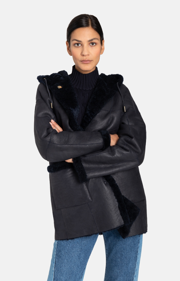 Ultraleichtes Material bei dieser lässigen Jacke mit angeschnittener Kapuze. Auf der Fellseite getragen zeigt sie ihre bequeme, leicht oversized gehaltene Silhouette mit unauf-fälligen, von Hand angenähten Druck-Knöpfen und aufgesetzten Taschen. Die Lederseite zeigt sich mit entspannter Nahtführung. Die Kapuzen-Weite lässt sich durch eine Leder-Kordel regulieren. Cooler Begleiter aus softem Material und softer Farbgebung.